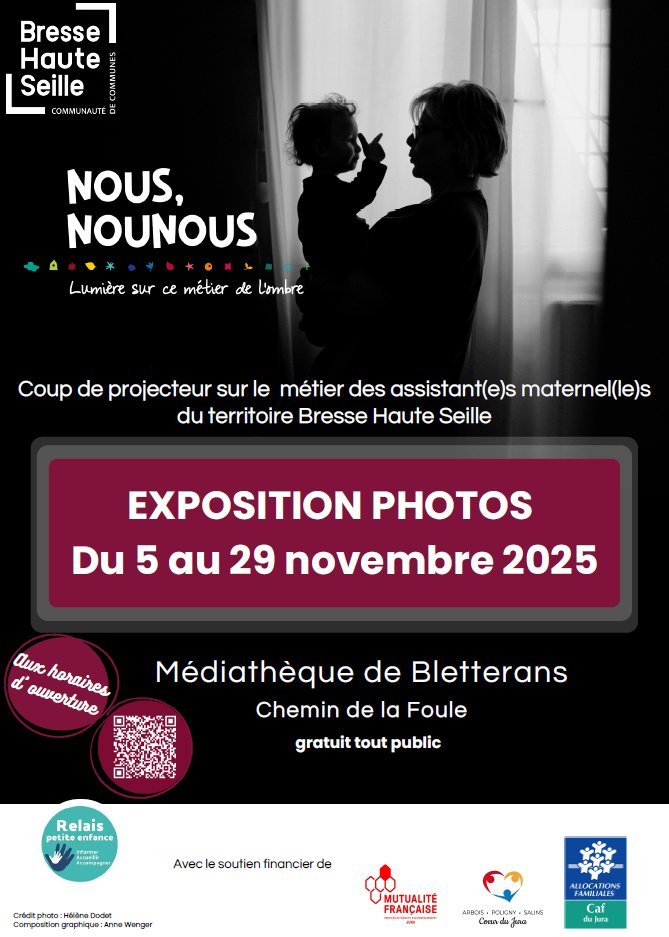 Du 5 au 29 novembre 2025, la Médiathèque Intercommunale accueille une exposition photographique consacrée au métier d'assistant (e) maternel (le) en collaboration avec le Service Petite Enfance. Photographié(e)s par Vincent Gartner, les professionnel(le)s du territoire Bresse Haute Seille vous font partager leur quotidien auprès des tout petits : premières découvertes, moments de complicité, de joie, métier qui va bien au-delà d’un simple « mode de garde »